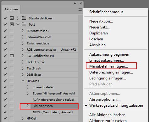 Dazu muss der letzte Eintrag in der Aktion angewählt werden. Über die kleine horizontralen Striche im Aktionsfenster oben rechts klappt ein Befehlsmenü auf. Wählt ihr "Menübefehl einfügen" an erscheint die untere Anzeige.